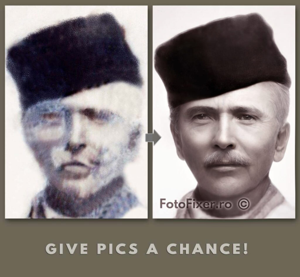Pe vremuri, oamenii își făceau una-două fotografii toată viața, nu 100 pe zi ca acum. O poză veche e un document unic, dacă ai pierdut-o, pa-pa! Ce faci, te duci la Oficiul Național pentru Poze Vechi de Familie și ceri un duplicat? Îi descrii poza lui Chat GPT și îl pui să ți-o refacă el? Ia, recuperează tu fotografia asta, portretul unui veteran al Războiului de Independență, ăla din 1877, da. Îți iese așa?